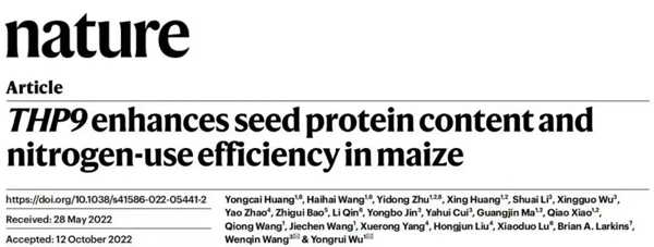 北京時(shí)間2022年11月17日,中國(guó)科學(xué)院分子植物科學(xué)卓越創(chuàng)新中心巫永睿研究團(tuán)隊(duì)與上海師范大學(xué)王文琴研究團(tuán)隊(duì)合作在Nature上發(fā)表了題為 “THP9 enhances seed protein content and nitrogen-use efficiency in maize”的研究論文。